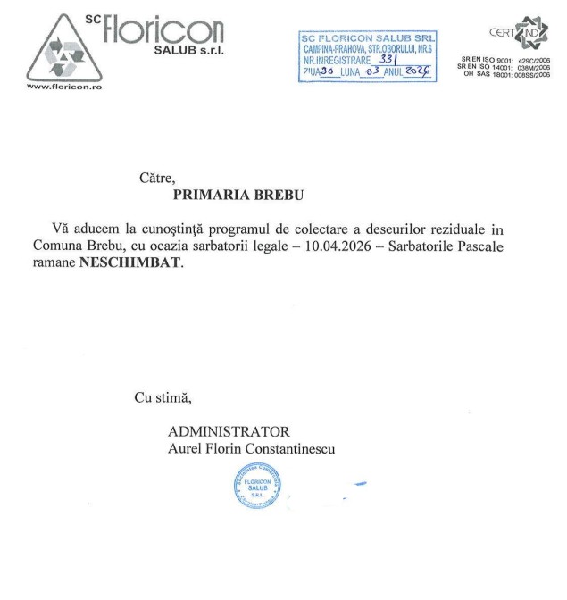 - Vă aducem la cunoștință că programul de colectare a deșeurilor reziduale din Comuna Brebu, în perioada sărbătorii legale din 10.04.2026 – Sărbătorile Pascale, rămâne neschimbat.